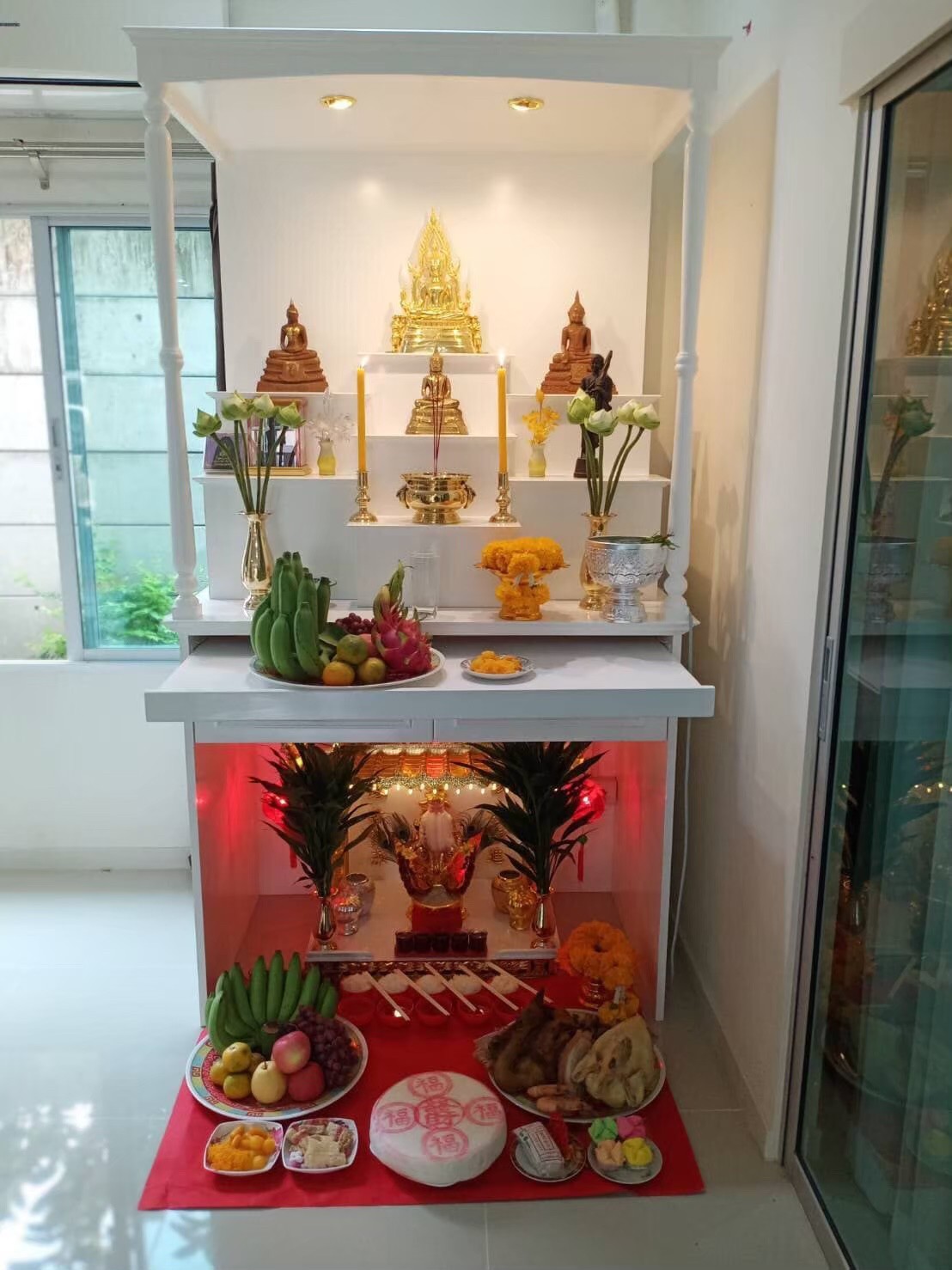 จะตั้งหันหน้าออกไปทางประตูห้อง โดยการจัด พระพุทธ จะอยู่ใต้บนเสมอ