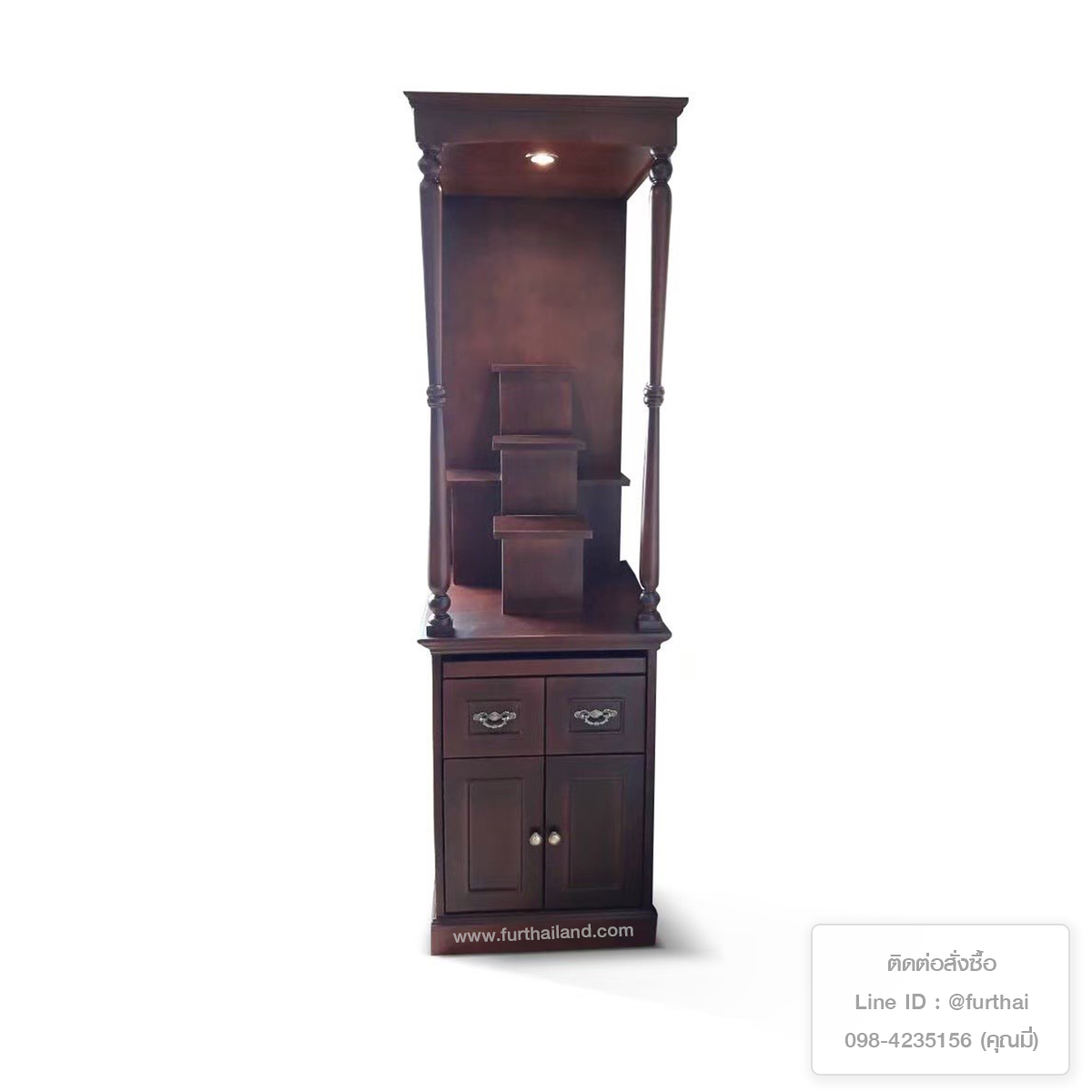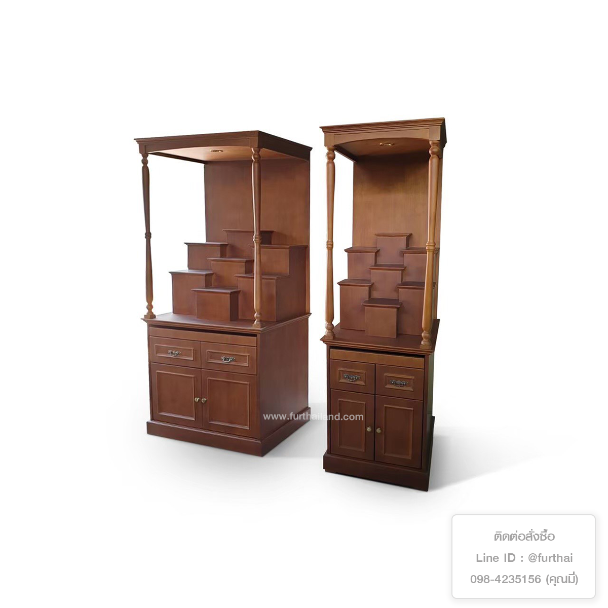 - ขนาดเล็กที่สุด 60x200 cm ทรงสูง ขนาดกะทัดรัด เหมาะกับบ้านที่มีพื้นที่จำกัด เช่น คอนโด หรือมีพื้นที่มุมห้องพระไม่กว้างนัก ที่ด้านล่างจะเป็นส่วนของตู้เก็บของ สำหรับเก็บของสำหรับบูชา ธูปเทียน ผ้าปู หรือของใช้จิปาถะอื่นๆ แบ่งสัดส่วนชัดเจน สะดวก ใช้งานง่าย